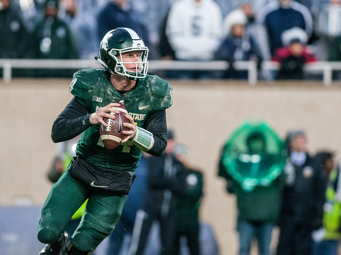 A few protesters speak with a police officer in tactical gear as a crowd stands behind them at the protest against police brutality at the East Lansing Police Department May 31, 2020.