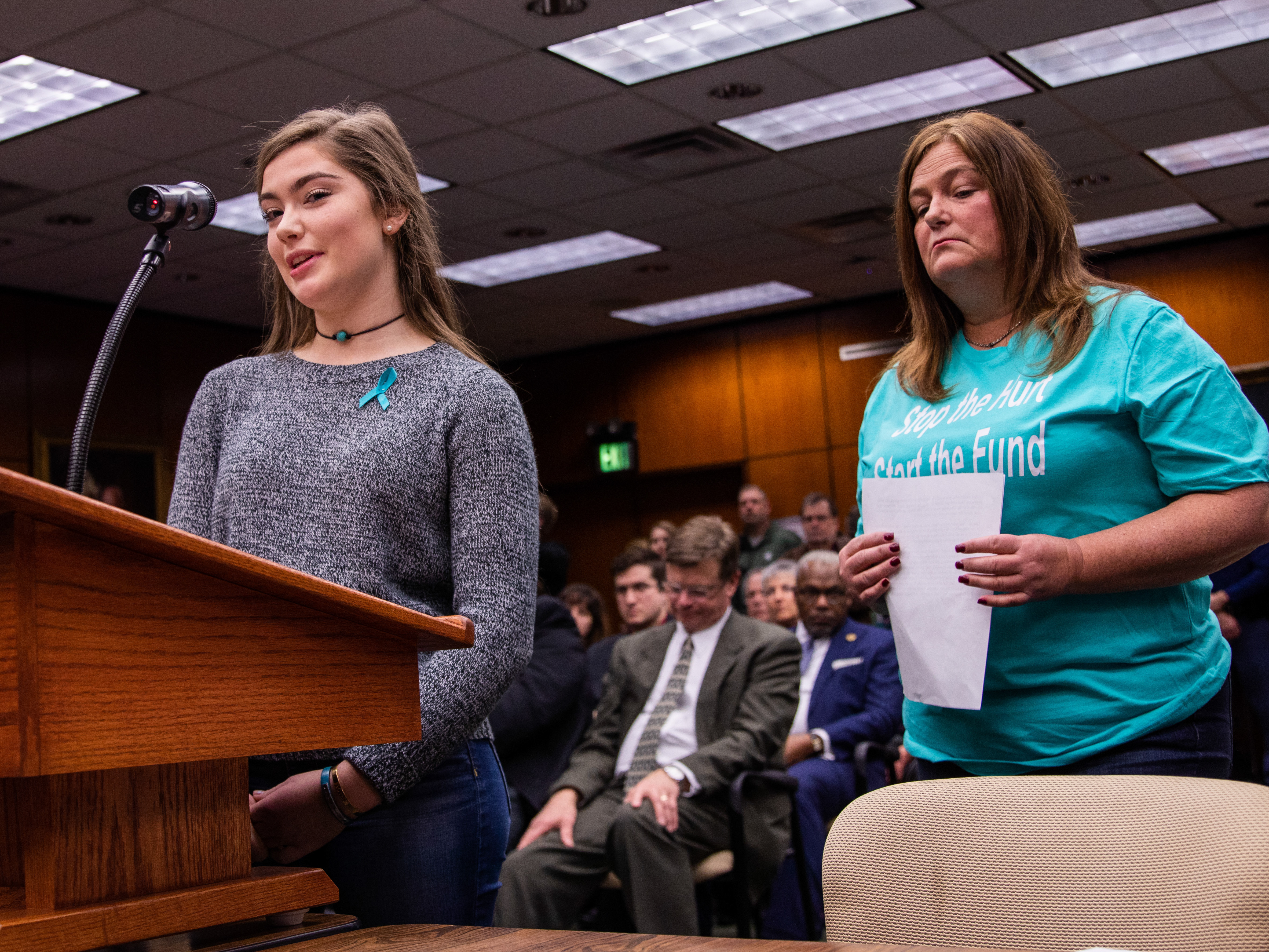 Lansing resident Farhan Sheikh-Omar turns to address the police officers sitting in the audience during the public comments section of the meeting about the internal investigation into the use of excessive force in the arrest of Uwimana Gasito Feb. 27, 2020 at the 54B District Court.